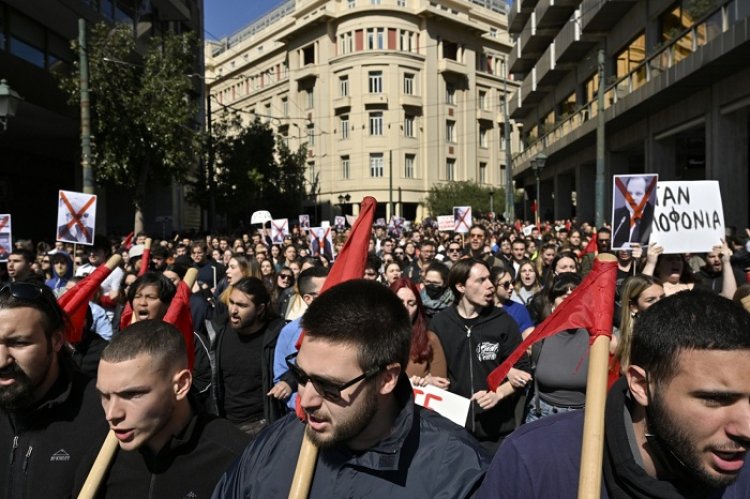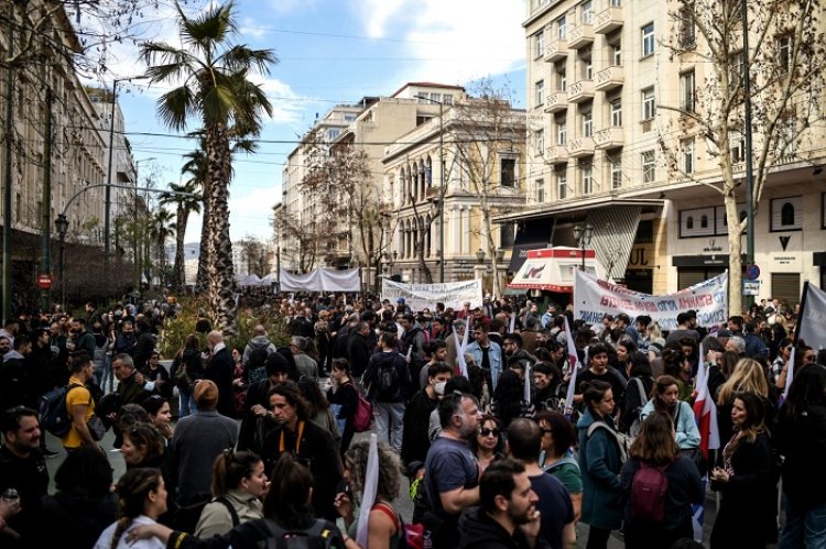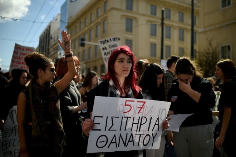 Dozens of masked, black-clad youths hurled Molotov cocktails and stones at riot police outside the building as more than 40,000 people demonstrated in the Greek capital over the accident on February 28 that killed 57 people.