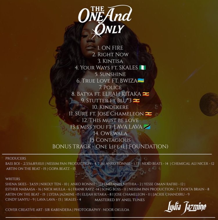Umuhanzikazi Lydia Jazmine wo muri Uganda yateguje album ye nshya, yise ‘THE ONE AND ONLY’’ izagaragaraho indirimbo yafatanyije n’abahanzi bo mu bihugu byo muri Africa barimo umuhanzi w’umunyarwanda BWIZA, bakoranye iyitwa ‘True Love’’, imwe mu ndirimbo 15 zizaba zigize album ye nshya.