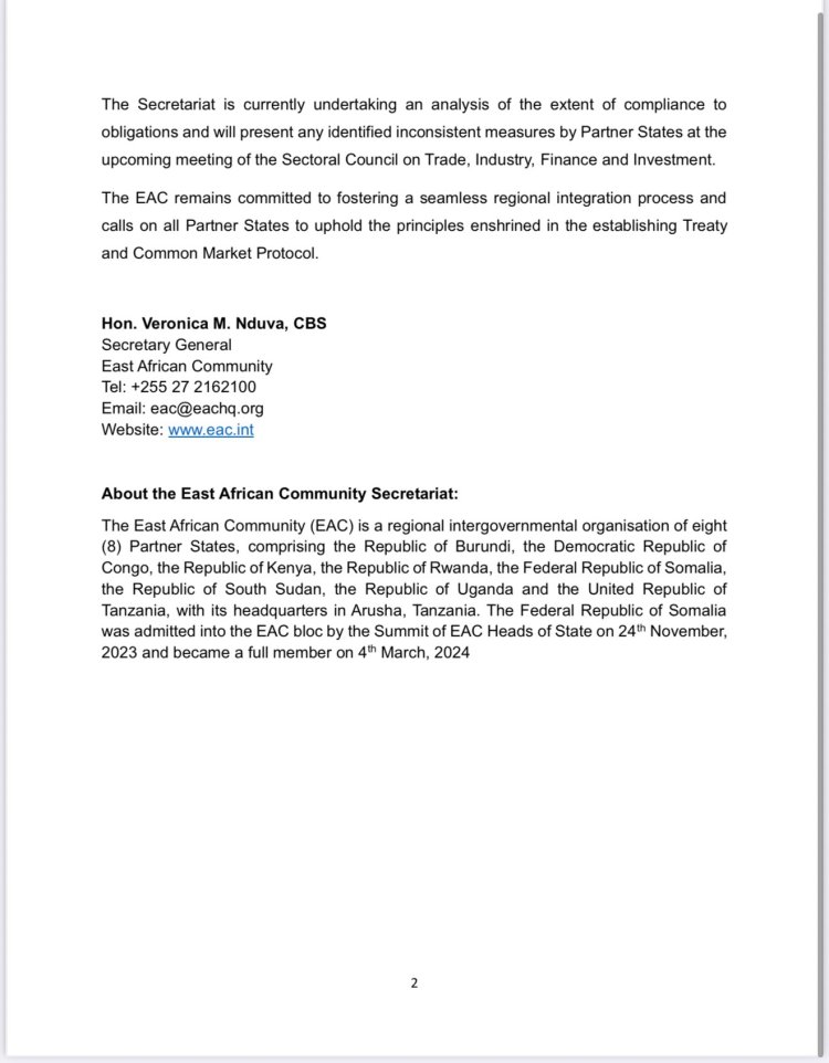 EAC yibukije ko kwishyira hamwe bisaba kubaha ibyo ibihugu byiyemeje, kandi ishimangira ko izakomeza kurengera ihame ry’isoko rimwe rizira inzitizi hagati y’ibihugu.