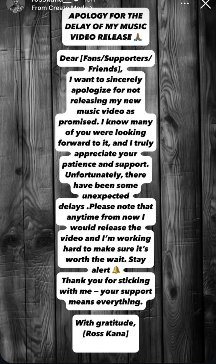 Ati: "abamfasha, abankunda, abafana ndetse ni nshuti ndashaka kwisegura ku bwo kudashyira hanze amashusho y indirimbo yange nshya nkuko nari nabibasezeranyije ndabizi mwari muyitegereje kandi ndabashimira cyane kubwo kwihangana no kunshyigikira habayeho impamvu zitunguranye gusa guhera none igihe icyaricyo cyose indirimbo yajya hanze kuko ndimo gukora cyane kugirango ibe yajya hanze.