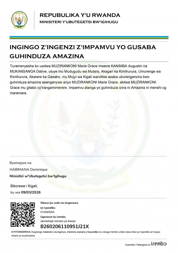 Ingingo z’ingenzi z’impamvu MUZIRANKONI Marie Grace, asaba guhindura amazina akitwa MUZIRANKONI Grace
