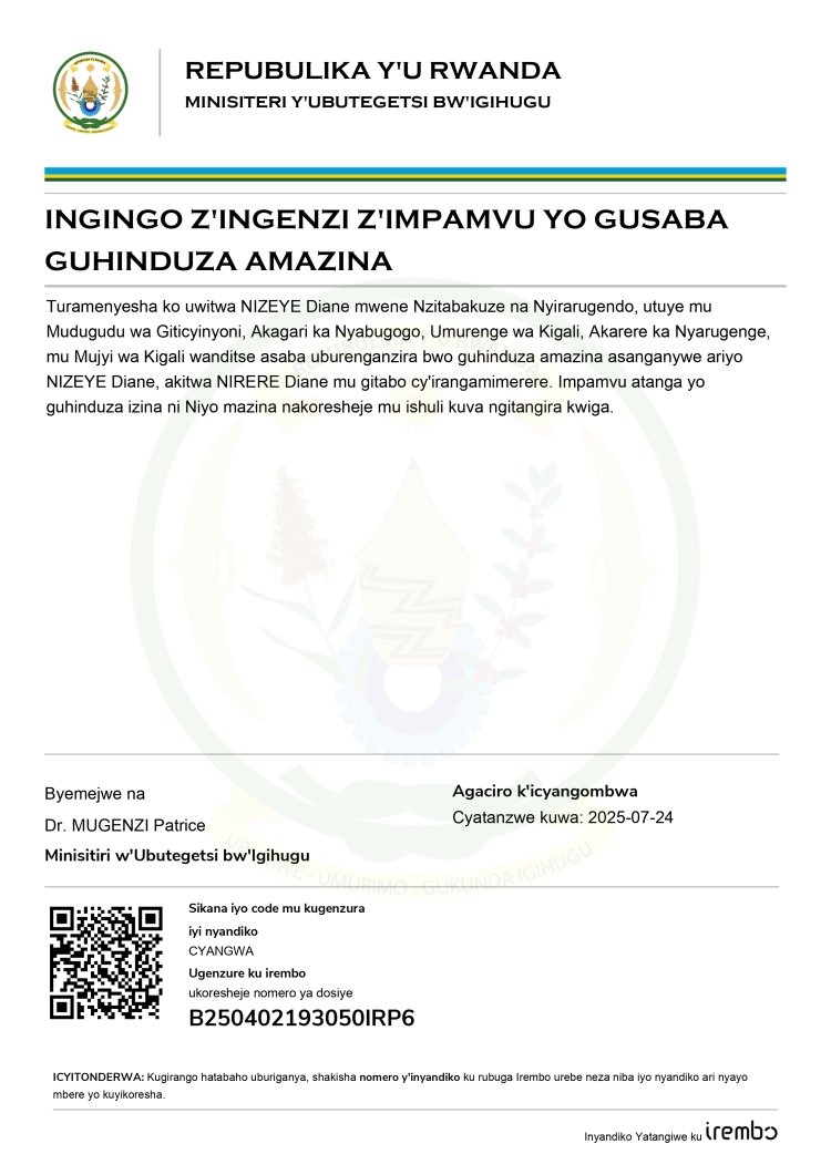 Ingingo z’ingenzi z’impamvu NIZEYE Diane, asaba guhindura amazina akitwa NIRERE Diane
