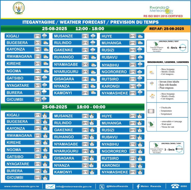 Ikigo cy’Igihugu cy’Iteganyagihe (Meteo Rwanda) cyatangaje ko ku wa 25 Kanama (08) 2025 hagati ya saa sita n’isaa kumi n’ebyiri (12:00 – 18:00), haragaragara ibicu byiganje bitanga imvura irimo inkuba mu bice bitandukanye by’igihugu.