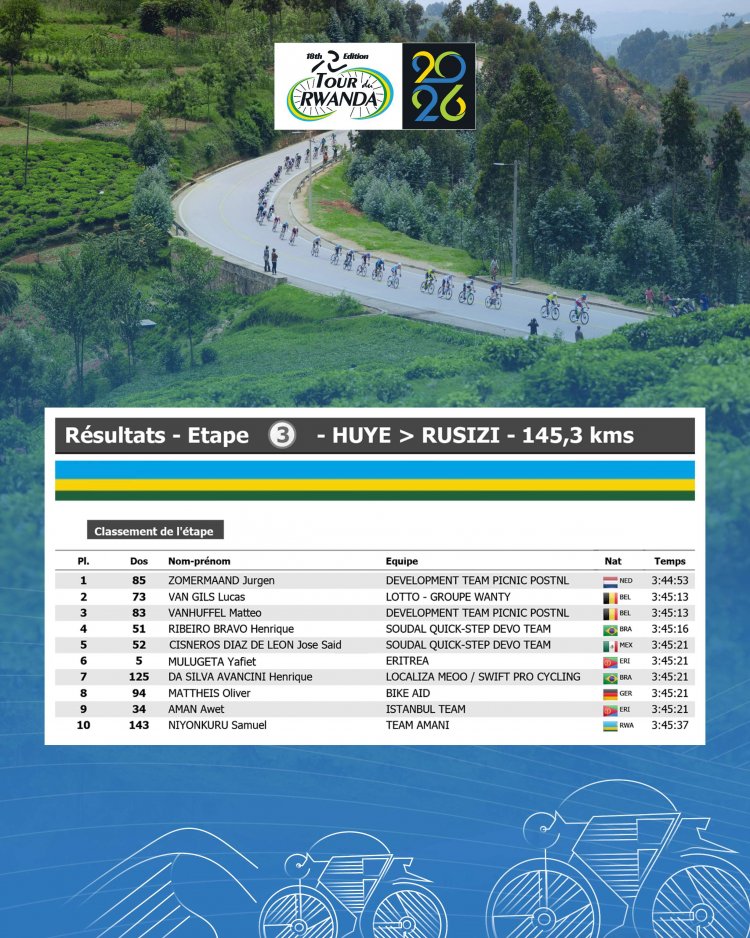 Umuholandi Jurgen Zomermaand w’imyaka 20 ukinira Dévelopment Picnic PostNL yegukanye agace ka gatatu ka Tour du Rwanda 2026 ka Huye- Rusizi akoresheje amasaha atatu, iminota 44 n’amasegonda 53.