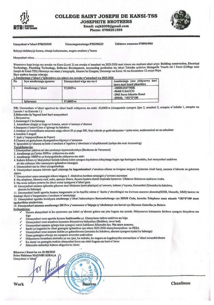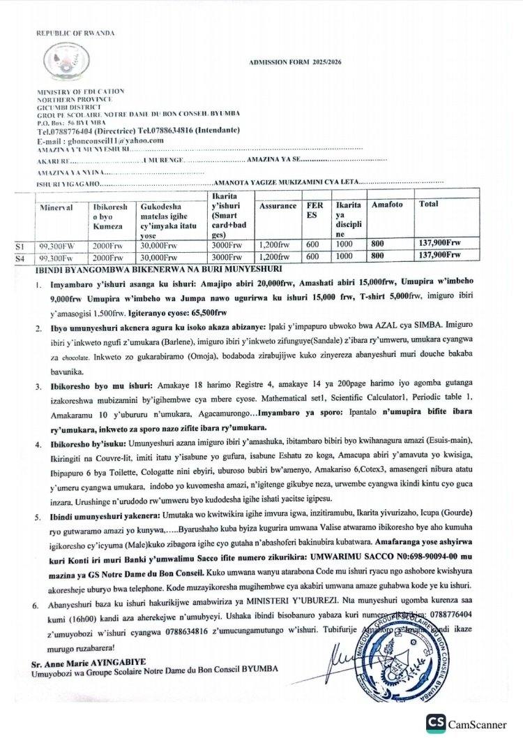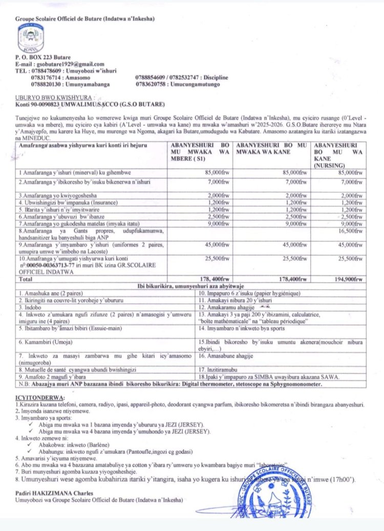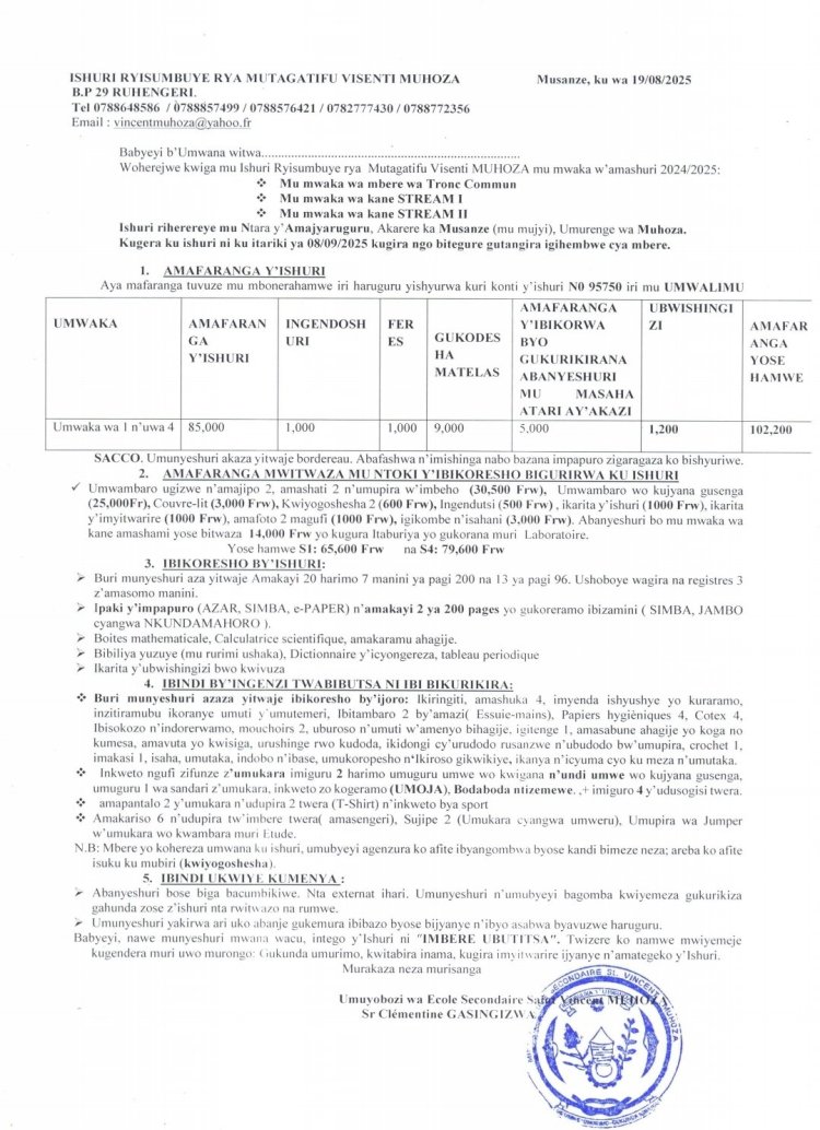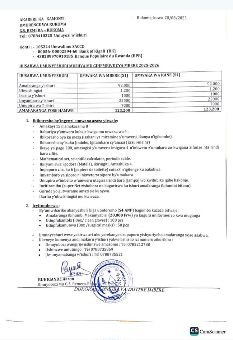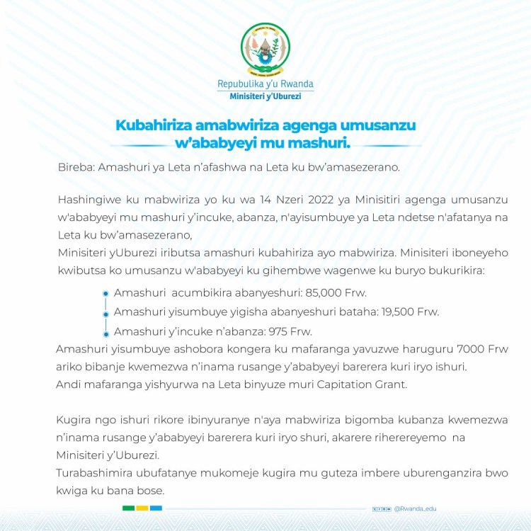 Hashingiwe ku mabwiriza yo ku wa 14 Nzeri (09) 2022, binyuzr mu itangazo ryayo, Minisiteri y'Uburezi ryasobanuye umusanzu w’ababyeyi ugomba gutangwa ndetse n'inzira zigomba gukoreshwa kugira ngo ikigo cy'amashuri cyongere amafaranga.