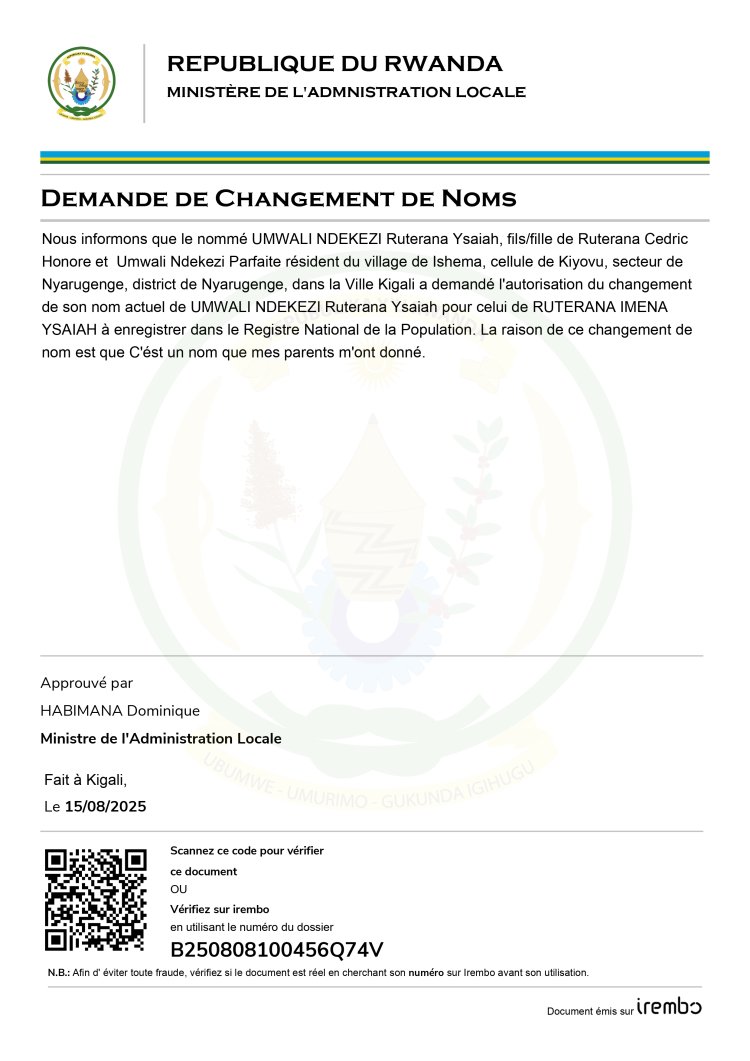 Points clés de la raison pour laquelle UMWALI NDEKEZI Ruterana Ysaiah demande à changer son nom en RUTERANA IMENA YSAIAH
