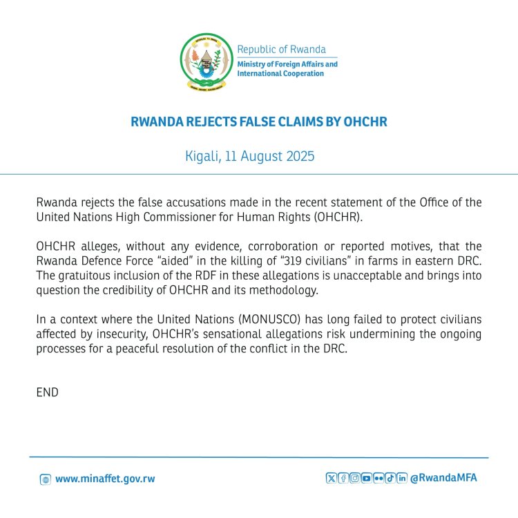 U Rwanda rwamaganye ibyo rwise ikinyoma bishingiye ku birego bishya byatanzwe n’ibiro by’ishami ry'Umuryango w’Abibumbye rishinzwe uburenganzira bwa muntu (OHCHR), bivuga ko Ingabo z’u Rwanda (RDF) zafashije mu iyicwa ry'abasivili 319 mu mirima yo mu burasirazuba bwa Repubulika Iharanira Demokarasi ya Congo (RDC).