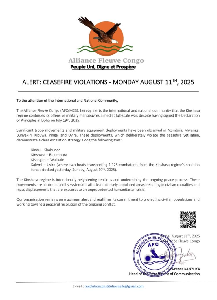 Mu itangazo ryatanzwe na AFC/M23, ryasinyweho n'umuvugizi Lawrence Kanyuka, rivuga ko yabonye ibikorwa byo kwegeranya ingabo n’ibikoresho mu bice bitandukanye birimo Uvira, Nzimbira, Mwenga, Bunyakiri, Pinga, Kibuwa, ndetse bigaragaza ko Leta yirengagije agahenge kemeranyijweho ndetse by'umwihariko amahame yasinyiwe I Doha.