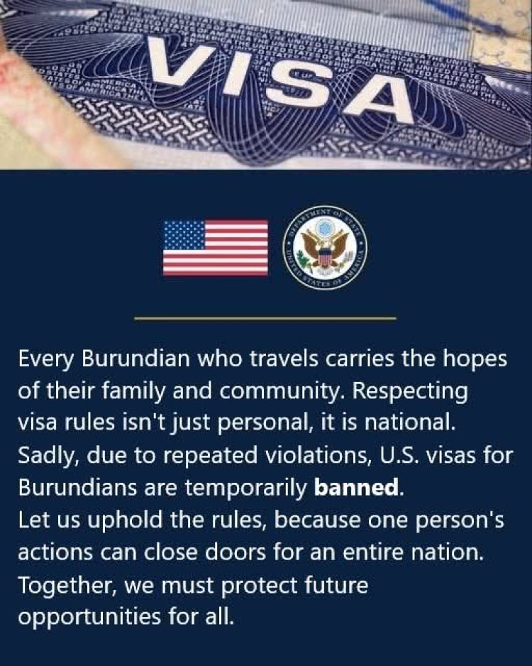 Leta Zunze Ubumwe za Amerika yahagaritse by’agateganyo gutanga Visa ku baturage b’u Burundi kubera kutubahiriza kenshi amategeko n'amabwiriza agenga abinjira n'abasohoka ku butaka bwayo. Iki cyemezo cyatangajwe n’Ambasade ya Amerika i Bujumbura ku wa 4 Kanama ( 08) 2025, nticyakiriwe neza na bamwe mu barundi.