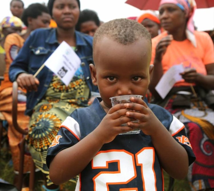 Ati: "Twayazanye ari amazi mabi, ariko tumaze kuyayungurura aba amazi meza ndetse turayanywa. Mu by'ukuri rero, abaturage baturiye hano bajyaga bagira ikibazo cyo kurwara inzoka, kuko ni amazi banywaga y'ikiyaga, ariko uyu munsi wa none, ibi bikoresho duhawe bigiye gutuma tugira ubuzima bwiza."