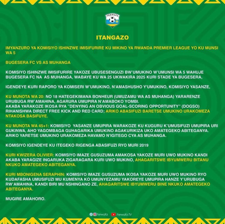Ishyirahamwe ry'umupira wamaguru mu Rwanda Ferwafa" ryongeye guhana abasifuzi babiri batitwaye neza mu mukino w'umunsi wa gatanu wa shampiyona wahuje Bugesera fc na As muhanga.