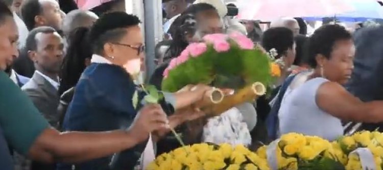 Ati: " Mukomere, mukomeze kwiyubaka mu budaheranwa kuko aribyo bizagamburuza uwo ari we wese wifuzaga ko mwazima. Ndagaya cyane, by'umwihariko ibyagaragaye ku bantu banze gutanga amakuru , bagakora n'ibikorwa byo gushinyagura birimo kubaka inzu ndetse no guhinga hejuru y'imibiri. Abakoze ibi barimo gukurikiranwa n'ubutabera."