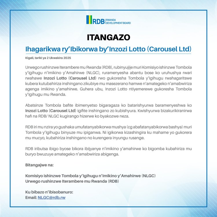 Urwego rw’Igihugu rushinzwe Iterambere (RDB) rwatangaje ko rwahagaritse uruhushya rwo gutegura Tombola y'igihugu rqari rwarahawe Inzozi Lotto (Carousel Ltd) kubera kutubahiriza amategeko n’amasezerano agenga imikino y’amahirwe.