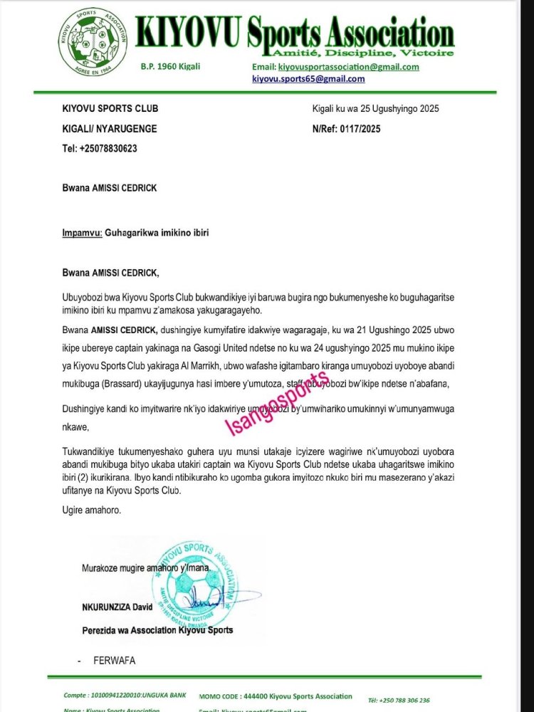 Mu ibaruwa yandikiwe Amis Cedric, yashyizweho umukono na Perezida w’Ishyirahamwe Kiyovu Sports, Nkurunziza David, ndetse Isango Star yabonyeho, yerekana ko ayo makosa yayakoze ku mukino wayihuje na Gasogi United wabaye ku wa 21 Ugushyingo (11) 2025 mu mukino wa Gasogi United ndetse n'umukino yakinye n'ikipe ya Al Merrikh wabaye ku wa 24 Ugushyingo (11) 2025.