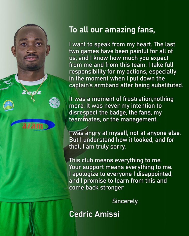 Cedric amissi nyuma yo guhanwa n’ikipe ye yasabye imbabazi abafana ba Kiyovu Sports ndetse n'abandi bababajwe n'imyitwarire mibi yamugaragayeho, avuga ko atari agambiriye gutesha agaciro igitambaro cyambarwa n'umukinnyi uyoboye abandi ahubwo yari yirakariye nawe ubwe kubera umusaruro w'iyi kipe muri iyo mikino yombi yatsinzwe.