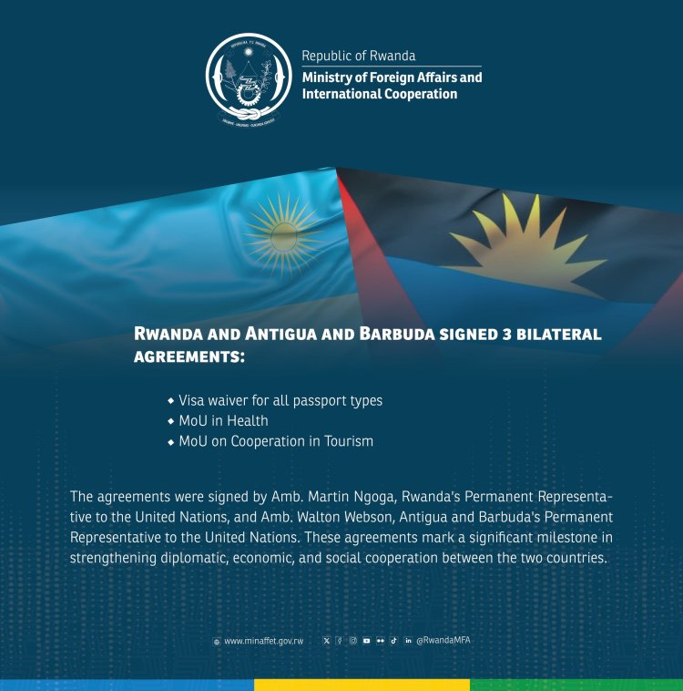Leta y’u Rwanda n’iya Antigua and Barbuda, zashyize umukono ku masezerano y’ubufatanye, bemeranya gukuriraho viza abaturage b’ibihugu byombi batunze pasiporo z’ubwoko bwose, zirimo izisanzwe n’iza dipolomasi, hagamijwe kurushaho kubyaza umusaruro amahirwe aboneka ku mpande zombi.