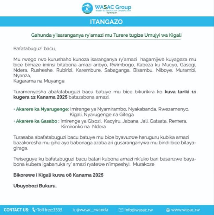 WASAC imenyesha abafatabuguzi bayo batuye mu bice byo mu turere twa Nyarugenge na Gasabo ko kuva tariki 11 kugera 12 Kanama 2025 batazabona amazi.