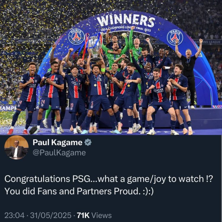 Nyakubahwa Perezida wa Repubulika y’u Rwanda, Paul Kagame, yashimiye ikipe ya Paris Saint-Germain (PSG) yegukanye igikombe cya UEFA Champions League cya 2025, ari na cyo cya mbere iyi kipe ibashije kwegukana mu mateka yayo. PSG ibaye ikipe ya kabiri yo mu Bufaransa itwaye iki gikombe gikomeye ku mugabane w’u Burayi.
