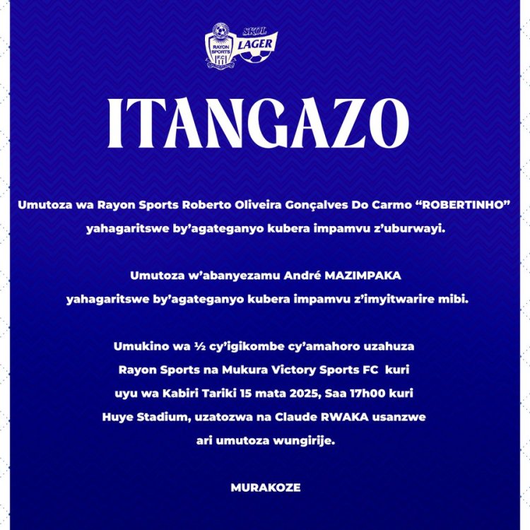Uyu musaruro niwo ubuyobozi bwa Rayon Sports bwashingiyeho buhagarika Robertinho wari umutoza mukuru na Mazimpaka André, umutoza w'abazamu bombi.