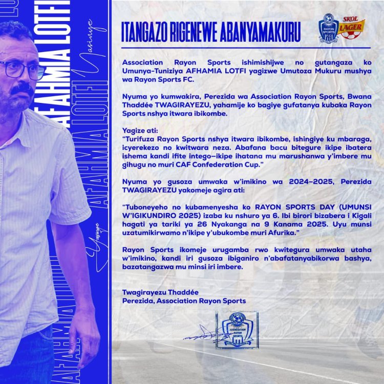 Ni mw'itangazo yanyujije ku mbuga-nkoranyambaga zayo, yatangaje ko uwari umutoza wa Mukura victory sports, afhamia Lotfi, ubu yagizwe umutoza mukuru wa Rayon Sports. Ibi byabaye nyuma yo gusozanya na Mukura Victory sports ku mwanya wa gatanu (5) n'amanota 41 ku rutonde rwa shampiyona 2024-2025.