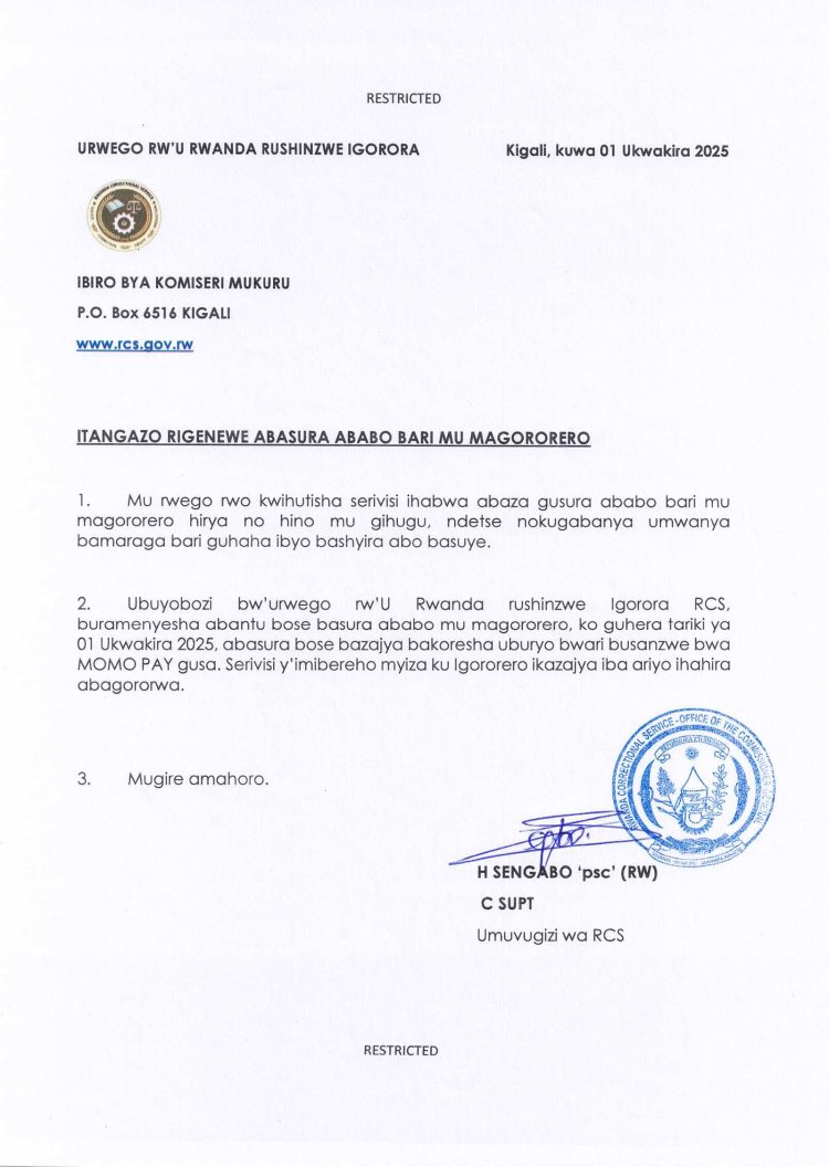 Ubuyobozi bw'urwego rw'u Rwanda rushinzwe Igorora RCS, bwamenyesheje abantu bose basura ababo mu magororero, ko guhera tariki ya 01 Ukwakira 2025, abasura bose bazajya bakoresha uburyo bwari busanzwe bwa MOMO PAY gusa. Serivisi y'imibereho myiza ku Igororero ikazajya iba ariyo ihahira abagororwa.