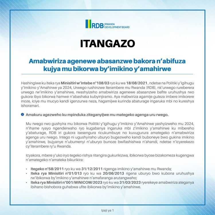 Urwego rw’Igihugu rushinzwe Iterambere (RDB) rwashyizeho amabwiriza mashya agenewe abifuza kwinjira cyangwa gukomeza gukorera mu rwego rw’imikino y’amahirwe mu Rwanda. Aya mabwiriza agamije kunoza imikorere y’uru rwego, kururinda ingaruka mbi no kurushyira mu murongo ujyanye na Politiki y’Igihugu y’Imikino y’Amahirwe ya 2024.