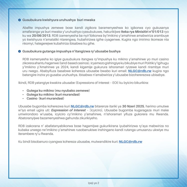 RDB yatangaje ko izajya isuzuma ubusabe bushya bwo gutangiza ibikorwa birimo za casino zikorera ahantu hagenwe ndetse n’imikino y'amahirwe ikorerwa kuri murandasi no mu nyubako zabugenewe.