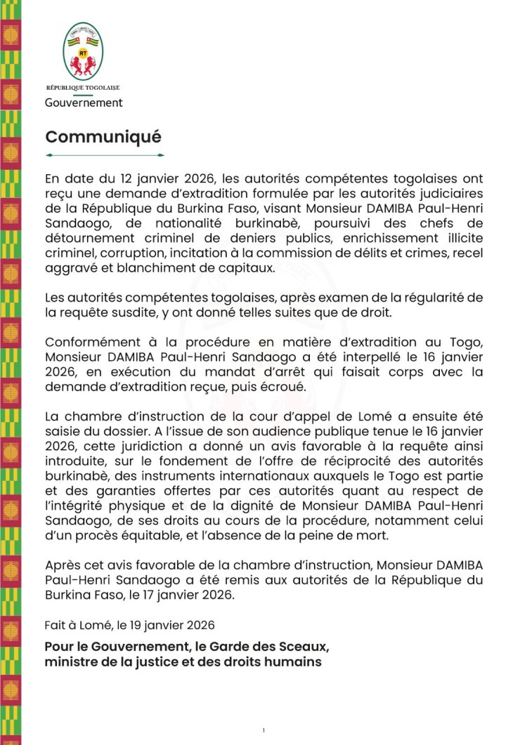 Leta ya Togo yatangaje ko yashyikirije Burkina Faso Paul-Henri Sandaogo Damiba, wahoze ari Perezida w’inzibacyuho w’icyo gihugu, ushinjwa kuba inyuma y’imigambi myinshi yo gushaka guhirika ubutegetsi bw'inzibacyuho buriho bwamuhiritse. Ni nyuma y'icyemezo gifashwe hagamijwe kubahiriza amategeko no gukomeza imikoranire mu by’ubutabera hagati y’ibihugu byombi.
