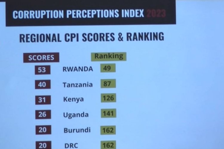 Muri iki cyegeranyo cy’Ubushakashatsi Ngarukamwaka ku miterere ya ruswa ku rwego rw’Isi (CPI) bwa 2023, u Rwanda rwaje ku mwanya wa 4 muri Afrika, mu gihe muri EAC igihugu kiza hafi ari Tanzania ifite amanota 40 u Burundi na RDC bihuriye ku manota 20 mu gihe Somalia ariyo iza ku mwanya wa nyuma ku isi n’amanota 11%, aho irushwa na Sudan y’Epfo amanota 2 gusa.