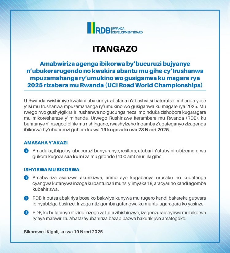 Urwego rw'igihugu rw'iterambere, RDB, yongereye amasaha yo gukora ku maduka, resitora, n’ibindi bikorwa byo kwakira abantu mu gihe cy’Irushanwa mpuzamahanga ry’Umukino wo Gusiganwa ku Magare (UCI Road World Championships) rigiye kubera mu Rwanda hagati ya 19 na 28 Nzeri (09) 2025. Ibi bikubiye mu mabwiriza mashya yashyizweho azagenderwaho muri iki gihe cy'iminsi umunani gusa.